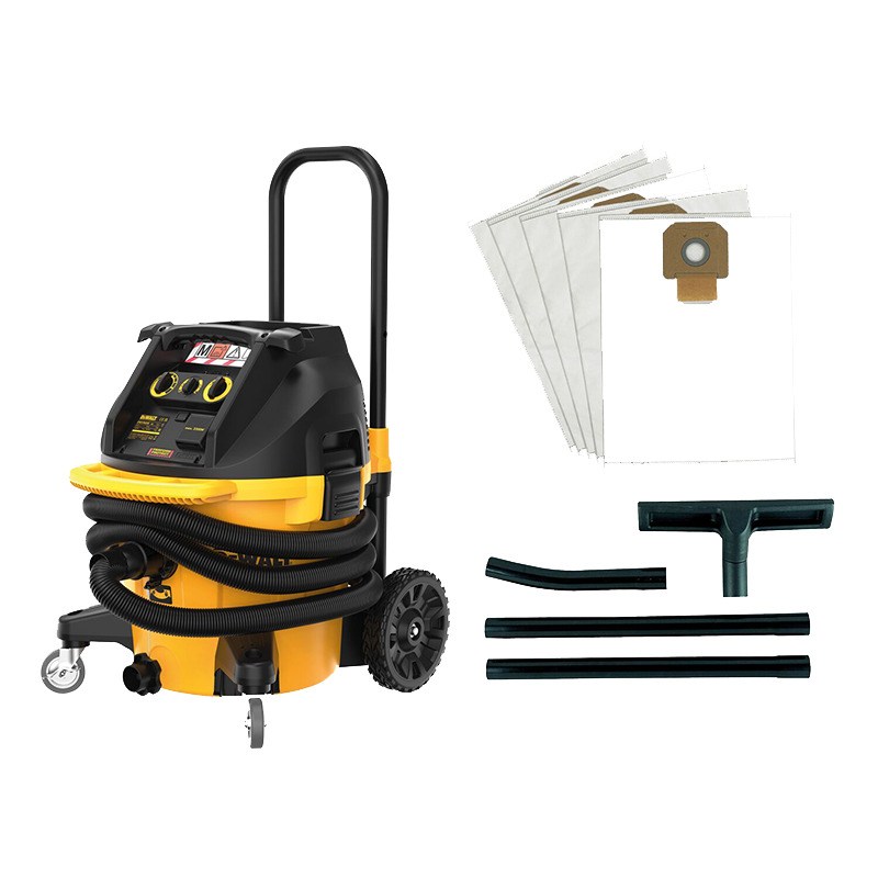 Profesionalni DEWALT DWV905MKIT-QS usisavač 38L M klase s automatskim čišćenjem filtera i Wireless Tool Control funkcijom. Snažan 1400W mokro/suhi industrijski usisavač za gradilišta i radionice.